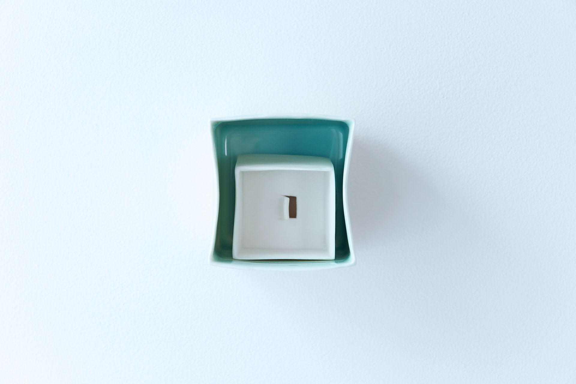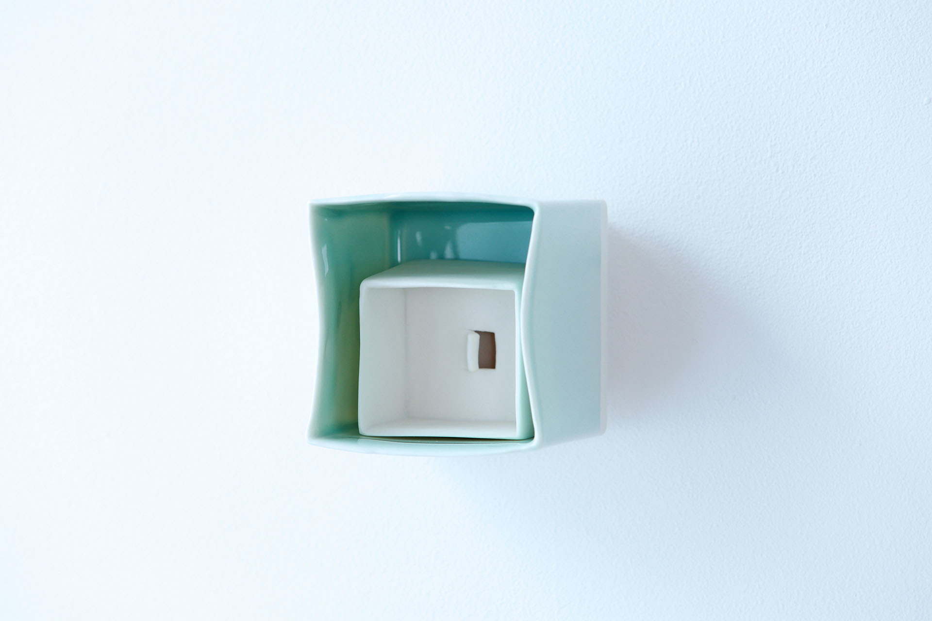 An individual porcelain box sits inside a blue-glazed porcelain box, wall mounted. These pieces are inspired by the Internal Spaces Sculptures Series. Please note: Sizes may vary slightly due to the nature of clay. The porcelain pieces are glazed by hand and colours may vary slightly.